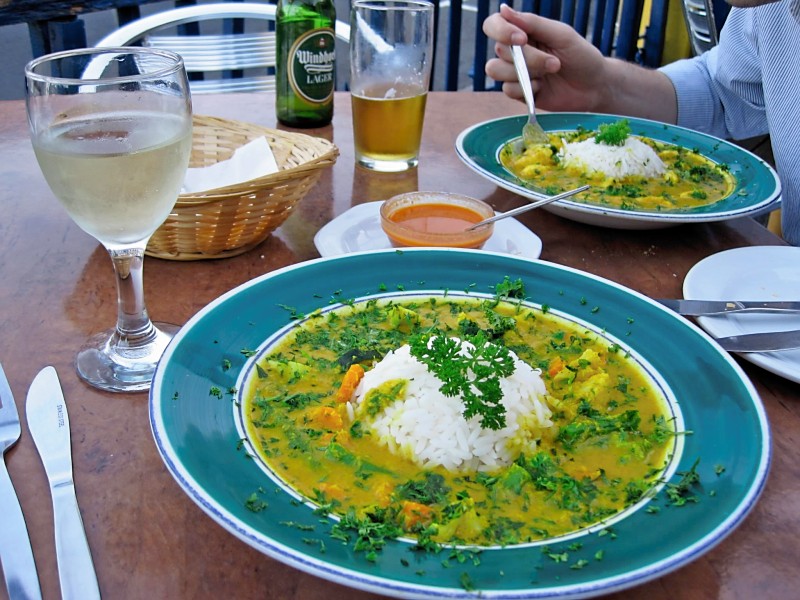 Because we will be entering Mozambique after South Africa, we needed to obtain a pricey visa (the consulate clerk asked us where we were from and almost laughed when we said the U.S.–he knew we were about to fork over more money than we wanted). Getting the visa required a bit maneuvering (racing through the center of the city to transfer bank funds on a time limit), but I think that is a good preview of what is to come as we hop from country to country. To reward ourselves, we sample some of Mozambique’s cuisine: vegetable and chicken curry.