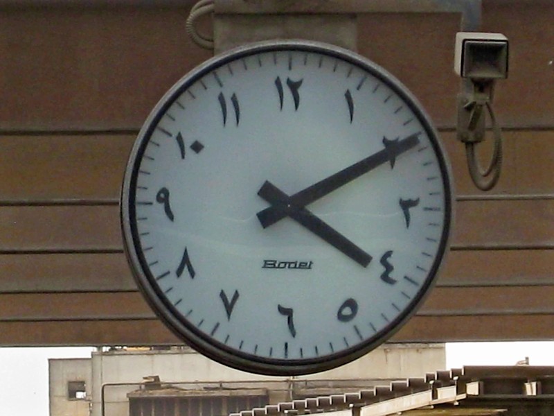 Travelıng to an Arabıc-speakıng country wıthout much language preparatıon presents unforeseen dıffıcultıes, lıke readıng bus numbers. We took a pıcture of thıs clock to serve as a cheat sheet for the numerals.