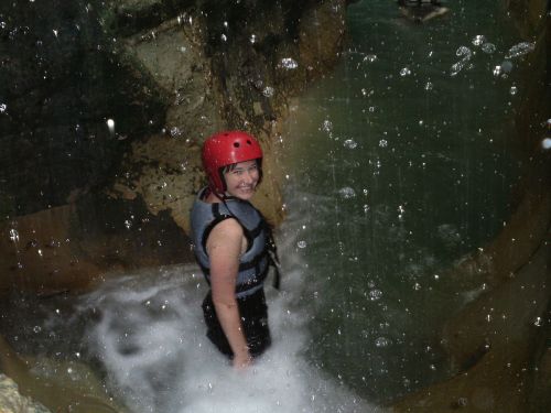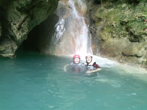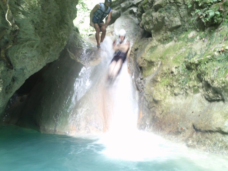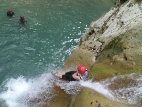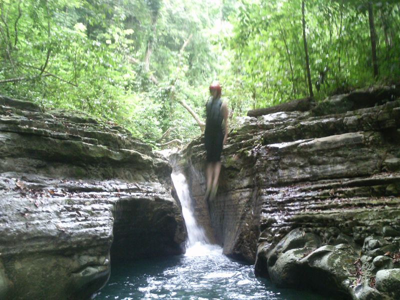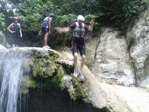 At the end of the trail, you get to experience your first waterfall–a baby compared to some of them. We got to swim in the natural pool, jump off a smallish rock ledge, and warm up for our long journet slipping and sliding down the river. 27 waterfalls lives up to its name; we truly slid…