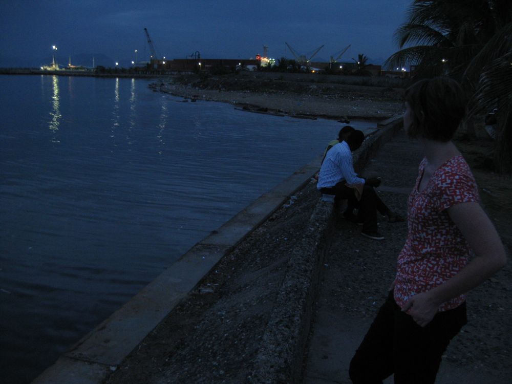Caroline looking at the port at dusk. We called this area–the part of Blvd de Mer that is scenic rather than sketchy–the Malecon, as it would be called in any Spanish-speaking country, although I have no idea what the French would call it.