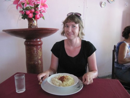 You also notice, if you patronize businesses (to the extent they can be called businesses) run by the government and intended for normal Cubans, everything is absurdly cheap. We ate lunch at this government-run Italian restaurant (“Comida Italiana”, as it’s creatively named). I had a pizza and Caroline had spaghetti. We shared a beer (the only packaged and thus safe drink on the menu). Our bill came to a whopping 27 pesos–just over a dollar.