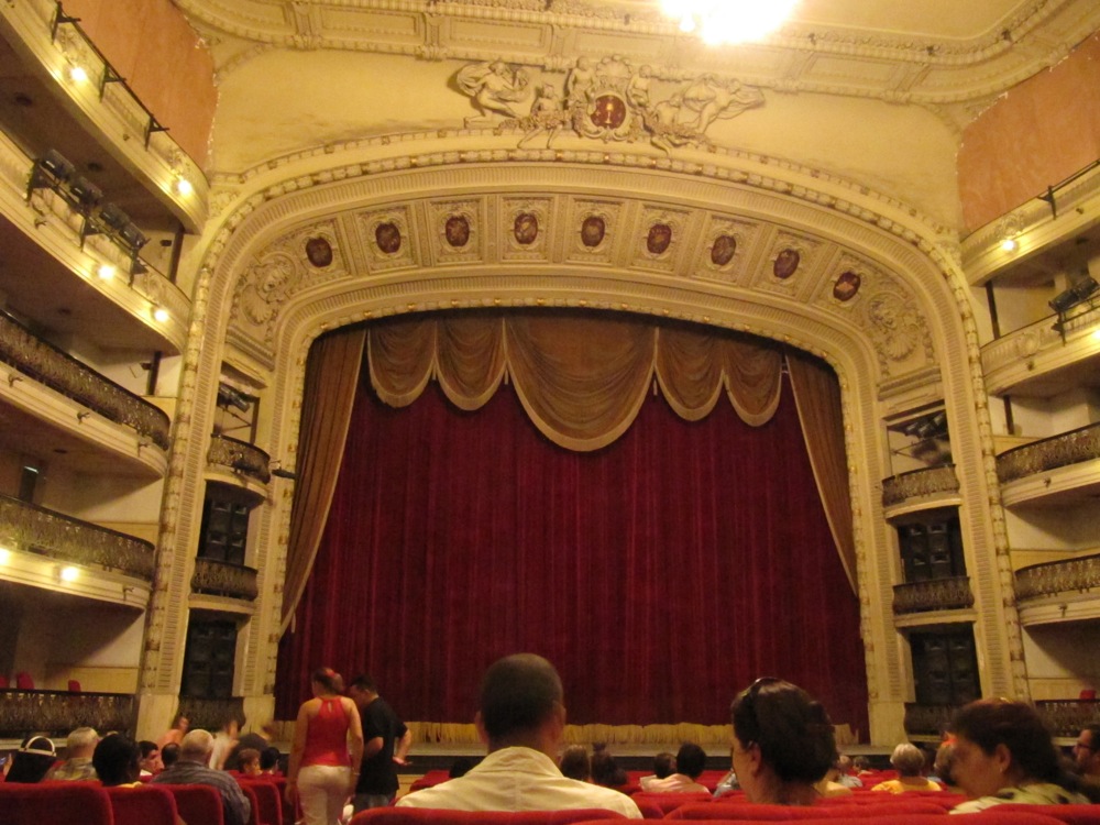 Alex read an article in The Economist before we left about Contemporary Dance of Cuba, the national contemporary dance group. I’m so glad he did, because otherwise, we would not have thought to go to their Friday night performance at the National Theater. For $25, we saw a truly phenomenal show. Neither of us have been to a true dance performance like this before, so we didn’t really know what to expect. We thought we might get bored or not understand it, but we were captivated the whole time. The dancers performed 4 different short dances before intermission, ranging from love stories to optical illusions (my favorite dance involved dancers looking like they were floating and folding into curtains). After intermission (and a Cuban mojito, por supesto), the dancers tackled a retelling of Carmen called “Is Carmen Gay?”. I might have more to say about that if I knew the story of Carmen really well, but even without that background knowledge, the dance was entertaining–and the costumes were fantastically fun.