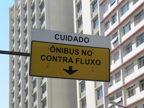 Portuguese is just close enough to Spanish to be dangerous. A Spanish speaker would probably read this something like “Caution: Bus does not go against flow”. In Portuguese, it means the opposite.