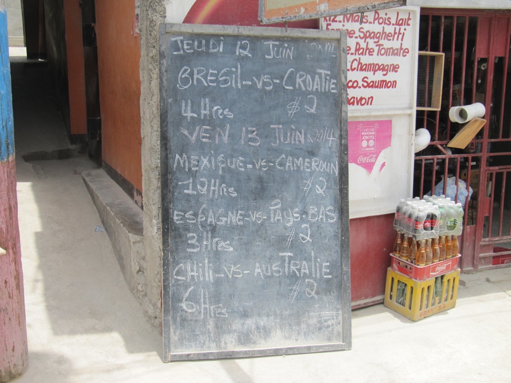 We went to Haiti during the buildup to the World Cup. Brazil is supposed to be the most soccer-obsessed place on the planet, but Haiti’s surely not far behind. Almost every moto taxi was adorned with a flag of the driver’s favorite team (typically Brazil, Germany, or Argentina). This chalkboard, among the forlorn sprawl of development on the highway out of town, advertises matches for customers to watch for a modest fee (2 Haitian dollars, or about 25 cents).